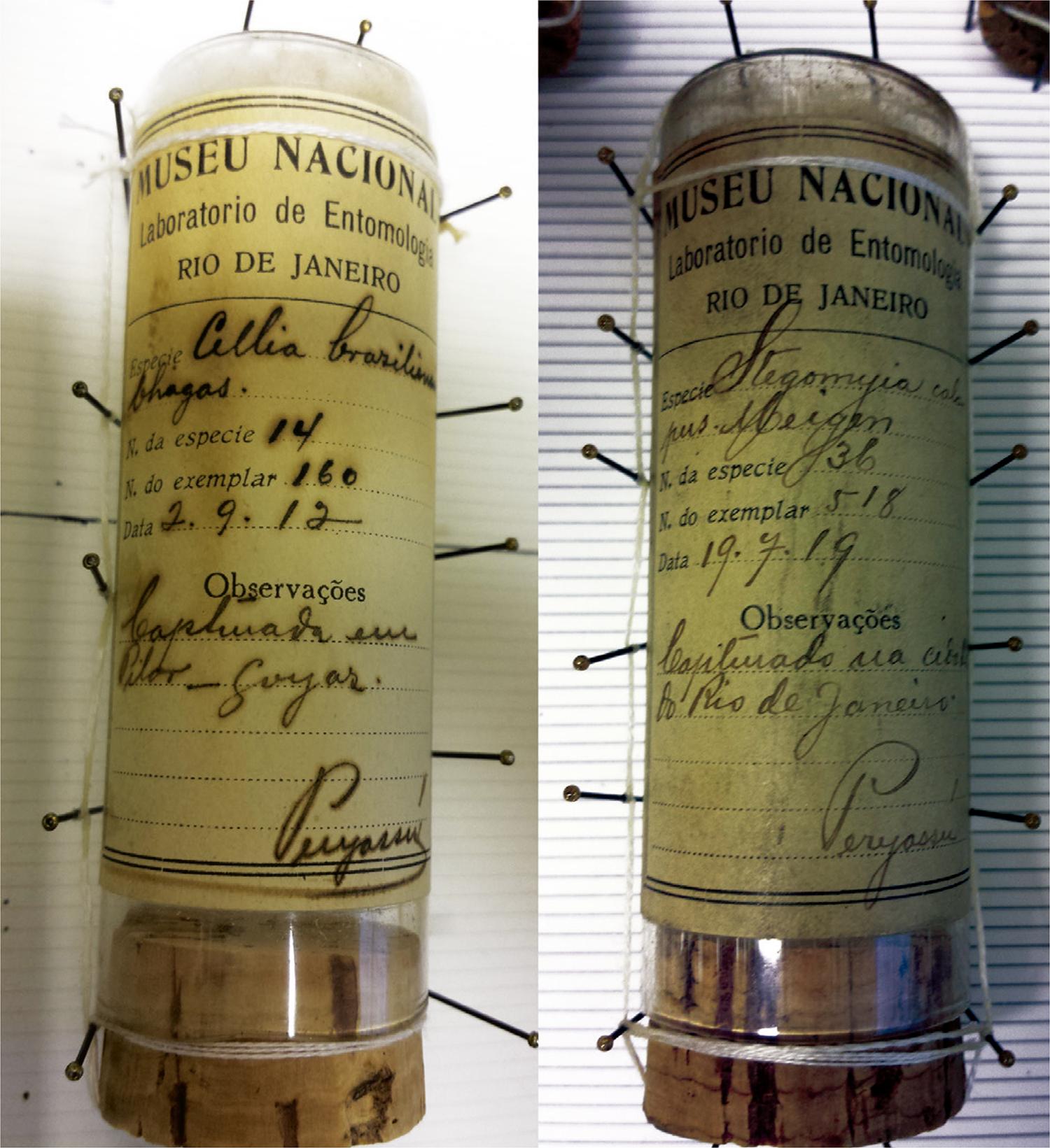Peryassú não coletou todo o material brasileiro depositado em sua coleção, e nem sabemos dimensionar que parte lhe teria sido transferida por guardas de serviços de combate a vetores de doenças como febre amarela e malária ou técnicos. Cabe lembrar que, durante a organização da coleção de mosquitos no MNRJ, Peryassú também atuou como inspetor do Serviço de Profilaxia Rural, no Rio Janeiro (1920-1922). Entre as atividades desses serviços sanitários, tanto rotineiramente quanto em ações especiais, incluía-se a captura de mosquitos. Por exemplo, após excursão para o diagnóstico das condições sanitárias do Vale do Rio Doce, no Espírito Santo, em 1922, Peryassú indicou que deveriam ser “capturados, com tubos de vidro ou saco de filó, todas as manhãs, entre 6 e 7 horas, os mosquitos que, por acaso tenham entrado no barracão” (O Paiz, 30 abr. 1923, p.3). Assim, é muito provável que a maior parte dos mosquitos depositados na Coleção Peryassú tenha sido coletada por auxiliares.3 Talvez por isso, o rótulo da maioria dos tubos não informava o nome do coletor.