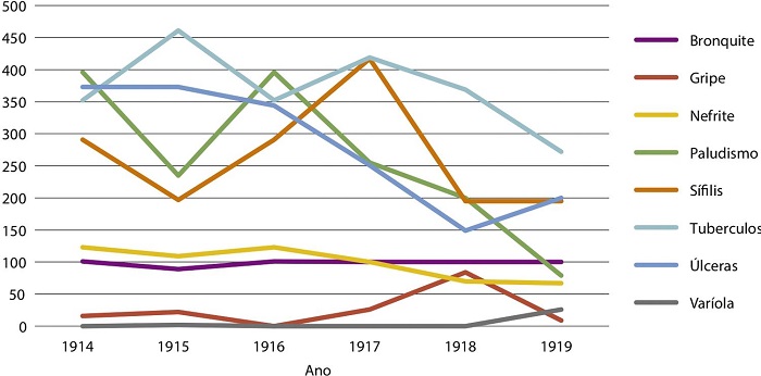 O gráfico demonstra que a tuberculose e o impaludismo foram as principais causas das internações hospitalares. No período analisado, de 272 a 461 tuberculosos estiveram em tratamento; de 79 a 396 internados sofriam de impaludismo; de 16 a 26 pessoas foram internadas com gripe, sendo que esse número chegou a 84, em 1918, e caiu para nove, em 1919. O número de doentes de varíola foi pequeno, de zero a dois, até 1918, e chegou a 26 no ano da epidemia. Chama a atenção, nesse período, a incidência de doentes de sífilis, com variação de 195 a 417 casos, e bronquite com média de uma centena de casos anuais.