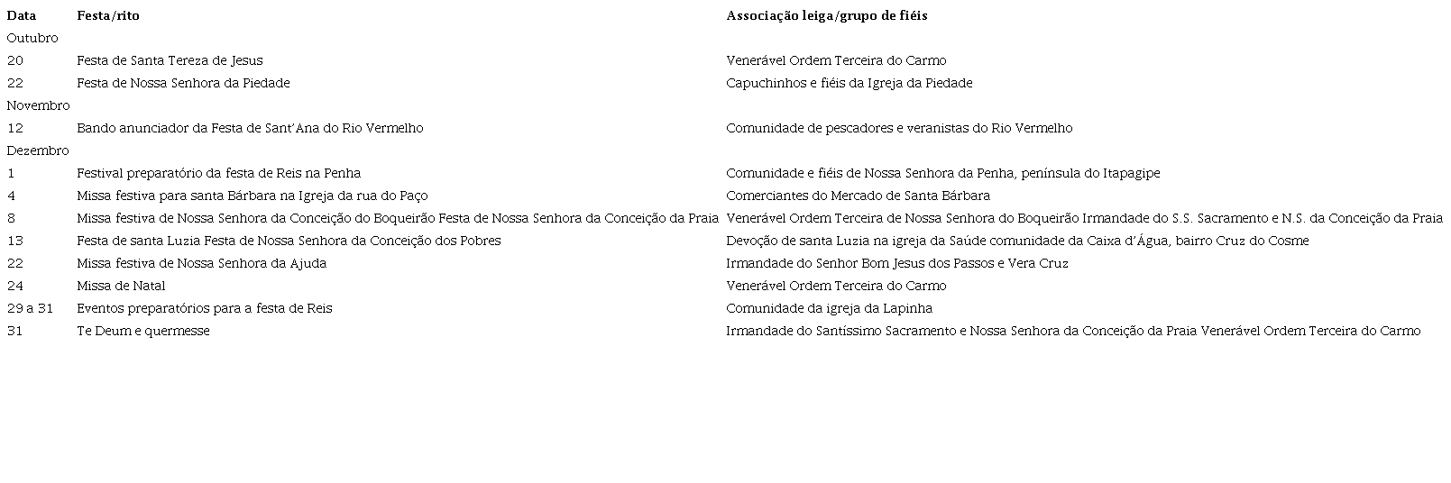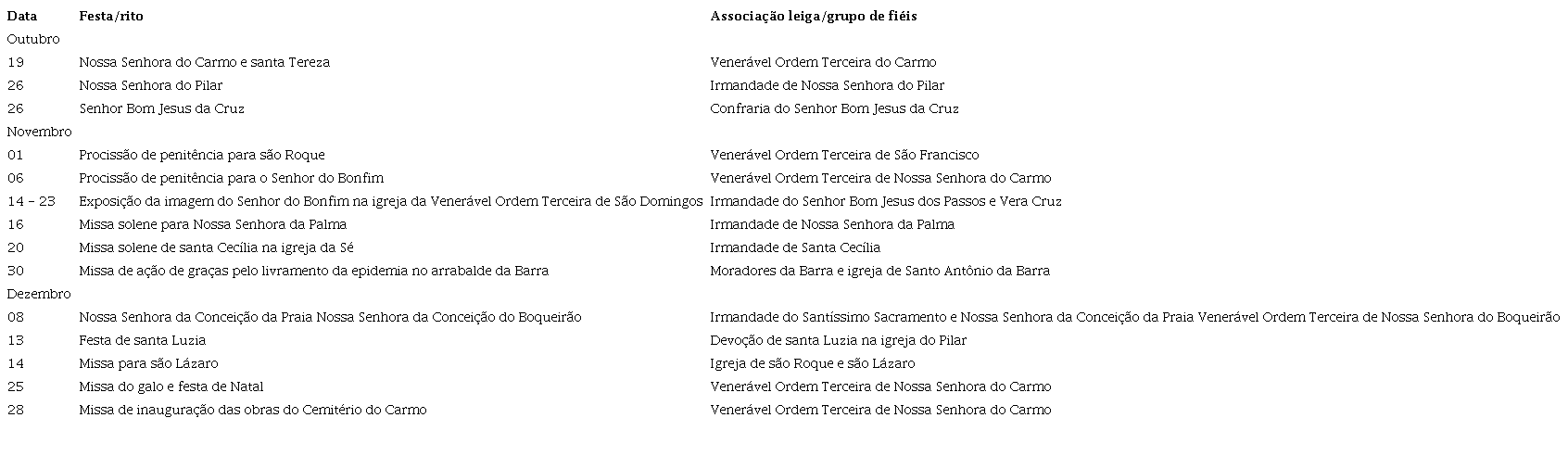 O alívio do fim da epidemia de gripe espanhola, entretanto, não durou muito. Seis meses separam esse surto de outro, o de varíola, que assolou a cidade no período de junho a dezembro de 1919. Passado o São João, de julho a setembro não há muitas festas de largo no calendário católico de Salvador. Por isso, escolhemos o período de outubro a dezembro para a análise das celebrações que ocorreram ou foram suspensas durante a epidemia de varíola. O Quadro 2 traz as datas, os eventos religiosos e os responsáveis por sua organização no segundo semestre de 1919.