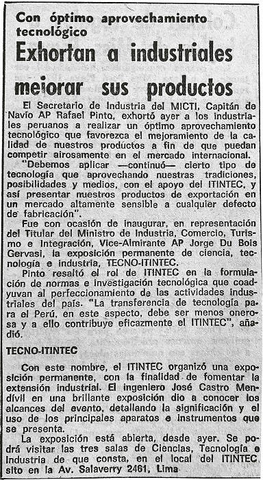 The press covered the museum’s opening, but the reports focused more on ITINTEC instead of the museum. The article on the inauguration noted the presence of Capitan Rafael Pinto Texeira, who represented the minister of Industry at the event. According to the newspaper, Pinto Texeira said: “We must apply a certain type of technology, taking advantage of our traditions, possibilities, and means, with the support of ITINTEC, to present our export products … the transfer of technology for Peru, in this aspect, should be less onerous, and ITINTEC contributes effectively to this” (Exhortan a industriales mejorar sus productos, 1979). The newspapers did not focus on the museum even when the article purportedly reported on the inauguration.