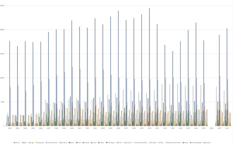 Conforme se pode observar na Figura 2, respeitante ao período compreendido entre 1882 e 1910, todos os distritos dispunham de hospitais, mas o mesmo não acontecia, ainda nos finais do século XIX, em alguns concelhos. Essa lacuna será resolvida, ainda no final de oitocentos ou no início do século XX, graças a iniciativas filantrópicas, nomeadamente de “brasileiros de torna-viagem”. São disso exemplo os hospitais de Paredes de Coura e de Póvoa de Lanhoso, dois concelhos do Norte do país. Em matéria de assistência hospitalar, a realidade da generalidade do país era claramente deficitária quando comparada com a de Lisboa e Porto, embora existissem outros hospitais bastante concorridos, como os de Braga e de Évora.