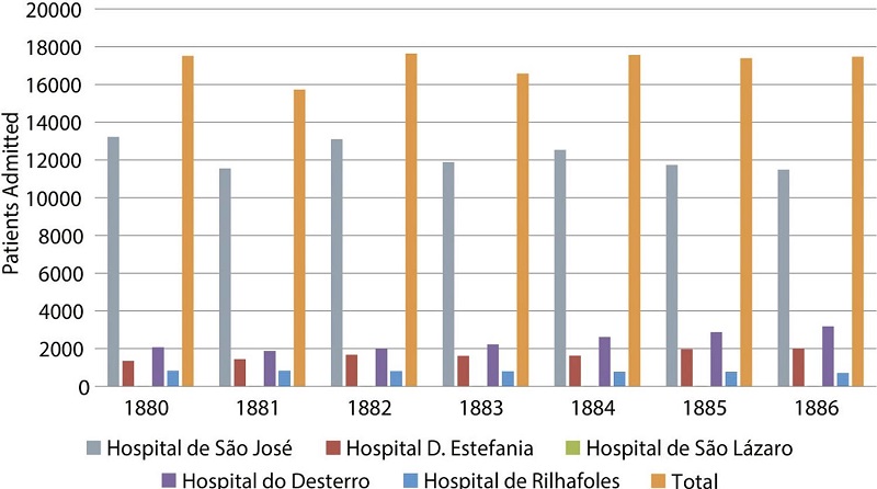 In addition to this foundational bibliography, we utilized archival sources related to the history of Lisbon’s hospitals from the National Archives of Torre de Tombo, the libraries of the Lisbon Central and Lisbon North University Hospital Centers, and online digital archives. The Bulletin of São José Hospital and Annexes (Boletim..., 1902, 1903, 1904, 1905, 1906, 1907, 1908, 1909, 1910, 1911, 1912, 1913),1 as well as the Statistical Yearbook (Annuario..., 1866, 1890, 1899, 1907b, 1907a, 1908, 1913; Anuário..., 1914, 1922, 1924, 1925, 1926c, 1926b, 1926a, 1927, 1928, 1929, 1930, 1931, 1932, 1933, 1934)2 are valuable sources for the study period.
