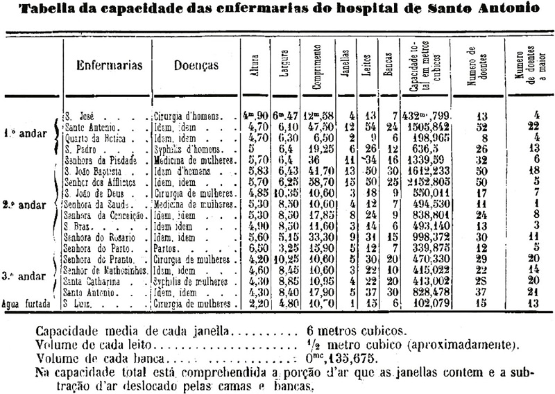 He made in his dissertation a detailed report specifying the size and capacity of the hospital interior, as we can see in Table 1, with “the indication of the average capacity of each window, the volume of each bed, the volume of the bench, and the total capacity, which includes the portion of air that the windows contain and the subtraction of air displaced by the beds and benches” (Albuquerque, 1867, p.43). The recognition of the need for fresh air was a certainty in 19th century hospital medicine. Figures like Peter Chalmers Mitchell, in London, and Carl Hagenbeck, in Hamburg, are known for improving ventilation and hygiene in hospitals in England and Germany because it was a crucial measure for health (Woods et al., 2018, p.36).