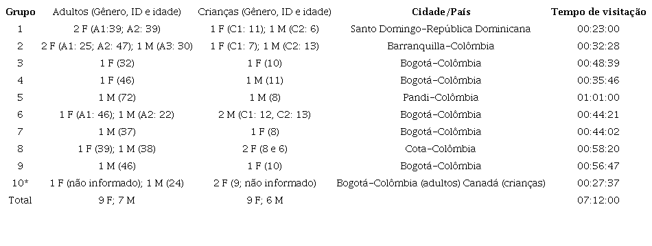 Foram abordados 13 grupos familiares, entre os quais houve três recusas, sendo duas justificadas: em uma, a criança não quis colocar a câmera; em outra, o responsável explicou que fariam a visitação de forma rápida. Assim, ao todo, dez grupos participaram da pesquisa. Como mostra o Quadro 1, reunidos, os grupos totalizam 31 sujeitos, sendo 16 adultos (nove mulheres e sete homens) e 15 crianças (nove meninas e seis meninos). Quanto aos vínculos de parentesco em relação às crianças, havia mães, pais, tios, tias, primos, avôs e avós. Com exceção do grupo 1 e das crianças do grupo 10, os demais participantes residem na Colômbia; a maioria (seis grupos) em Bogotá, onde o museu se localiza. O tempo médio de visitação foi de 43 minutos.