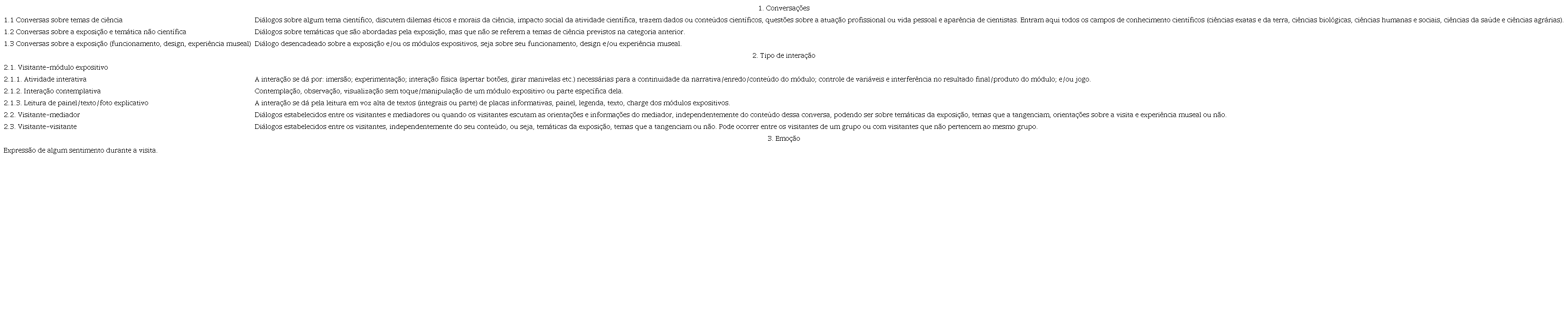 É importante ressaltar que a categoria “emoções” reflete o ponto de vista dos pesquisadores. Não buscamos afirmar o que os visitantes de fato sentem, e sim refletir sobre a presença de expressões emocionais na relação entre sujeitos e exposição, a partir da observação dos pesquisadores. Em consonância com Rowe et al. (2023, p.79), buscamos observar “marcadores discursivos de emoção tais como entonação, expressão facial, gestos, palavras com conotação emocional, exclamações, risadas e expressões corporais”. Entretanto, foge ao escopo deste artigo o aprofundamento da reflexão sobre a dimensão emocional nas visitas a museus, tema complexo que esbarra em desafios metodológicos tais como a própria definição de emoção e a dificuldade em mensurá-las (Boehner et al., 2007; Boyd, Hugues, 2020; Falk, Gillespie, 2009; Massarani et al., 2022b; Myers Jr., Saunders, Birjulin, 2004).