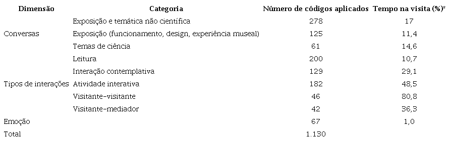 Na análise dos dados audiovisuais, foram aplicados, durante as sete horas e 12 minutos de visitação, 1.213 códigos, dos quais 1.130 compõem as categorias abordadas neste artigo. Conforme indicado na Tabela 1, os cinco códigos mais aplicados foram: conversas sobre a exposição e temática não científica (278), leitura de painel/texto/foto explicativo (200), atividade interativa (182), interação contemplativa (129) e conversas sobre a exposição (funcionamento, design, experiência museal) (125). Ao levarmos em consideração o fator tempo, os cinco códigos mais relevantes foram: interação visitante-visitante (presente em 80,7% do tempo total das visitas), atividade interativa (48,5%), interação visitante-mediador (36,3%), interação contemplativa (29%) e conversas sobre a exposição e temática não científica (17%). Notamos ainda que as conversas sobre temas de ciência, no que tange ao fator tempo, passam a ser o segundo tipo de conversa mais relevante, superando aquelas sobre a exposição (funcionamento, design, experiência museal).