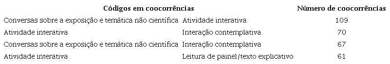 Em termos de coocorrência, as cinco mais relevantes estão indicadas na Tabela 2. Destaca-se a elevada coocorrência entre conversas sobre a exposição e temática não científica e atividade interativa, o que sugere que as atividades interativas propostas estimularam diálogos sobre o tema da exposição. Mas também foram relevantes os casos em que essas conversas estiveram associadas com a contemplação e a leitura de textos. Contemplação e realização de atividades interativas ocorreram juntas setenta vezes, sugerindo que, enquanto um visitante interagia ativamente com o aparato, os(as) demais não necessariamente o faziam junto, por vezes ficando contemplando a interação feita.