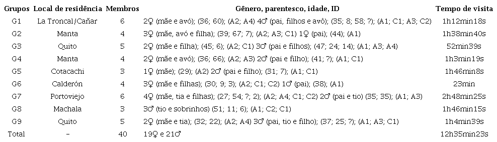 Quarenta visitantes participaram da pesquisa, sendo 19 do gênero feminino (13 adultas e 6 crianças) e 21 do gênero masculino (13 adultos e 8 crianças). Em sua maioria, os adultos responsáveis eram os progenitores, à exceção de G8, na qual o tio era o responsável. O Quadro 1 sintetiza as informações sobre as famílias e o tempo de visita de cada uma.