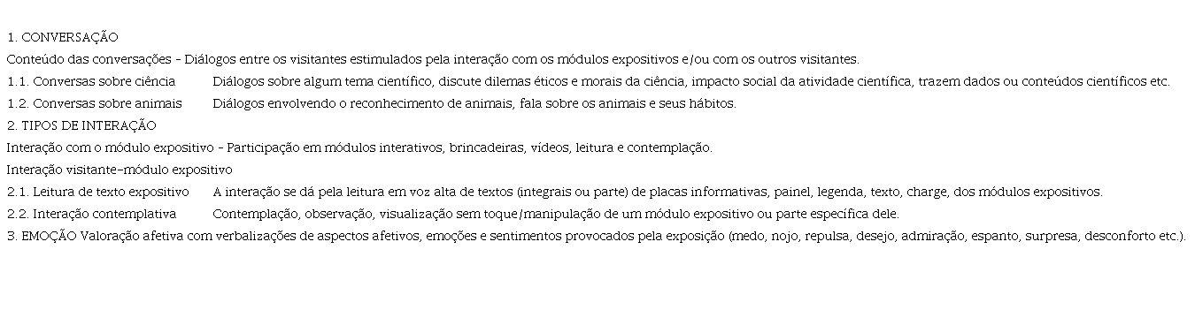 Para a análise das visitas, foi utilizado o protocolo desenvolvido pela rede de pesquisadores envolvidos no projeto, adaptado de Allard e Boucher (1998), que investigaram, nesse trabalho, as relações entre os atores fundamentais em uma exposição: módulos expositivos, mediadores e visitantes. O protocolo de análise e codificação das visitas está dividido em cinco dimensões, a saber: conversação; interação; emoção; fotos e mudança. Neste trabalho exploramos as de maior ocorrência, que seguiram para uma análise mais aprofundada: conversação, interação e emoção. No Quadro 2 apresentamos a descrição dessas categorias e subcategorias em suas respectivas dimensões.