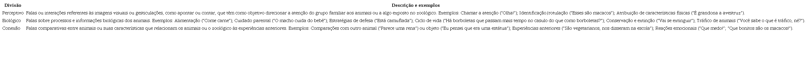 Geerdts, Walle, Lobue (2015) abordaram a temática familiar em zoológicos, concentrando-se em averiguar se os pais fornecem informações que apoiem o conhecimento biológico emergente das crianças nesse ambiente. Em seu estudo, utilizaram as categorias perceptivo, conceitual, biológico, social e conexão para classificar os tipos de conversas recorrentes em grupos familiares durante a visita. Para os autores, as interações familiares durante as visitas revelam oportunidades de aprendizagem que podem influenciar o desenvolvimento das primeiras teorias biológicas e psicológicas das crianças sobre os seres vivos (Geerdts, Walle, Lobue, 2015). Detalhamos a seguir as categorias perceptivo, biológico e conexão, as quais utilizamos como base para classificar as conversas mais representativas do presente estudo.