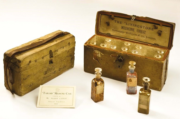 Sir Henry Wellcome’s Museum Collection of historical medical objects held by the Science Museum London contains a set of medicine chests carried by scientists, explorers, politicians, military and missionaries on famous journeys in different parts of the world. One such chest, a Tabloid from the Congo sub-line, was used by the American explorer Hamilton Rice in his 1919-1920 expedition to the Negro and Orinoco rivers and their tributaries in the northwestern Amazon. Its standard market price was around £24, the equivalent of approximately £1,500 in today’s currency, hardly an affordable item (BWC, 1901, p.35).