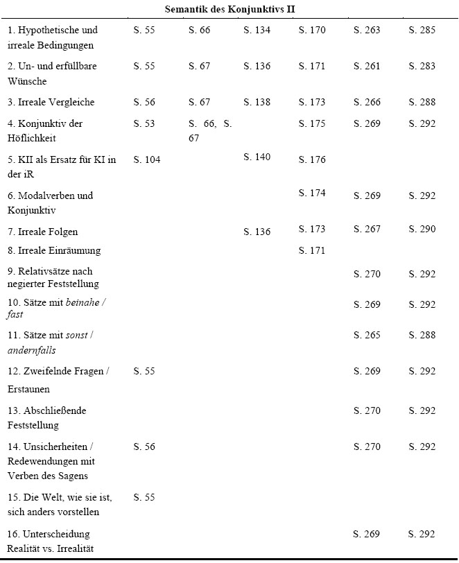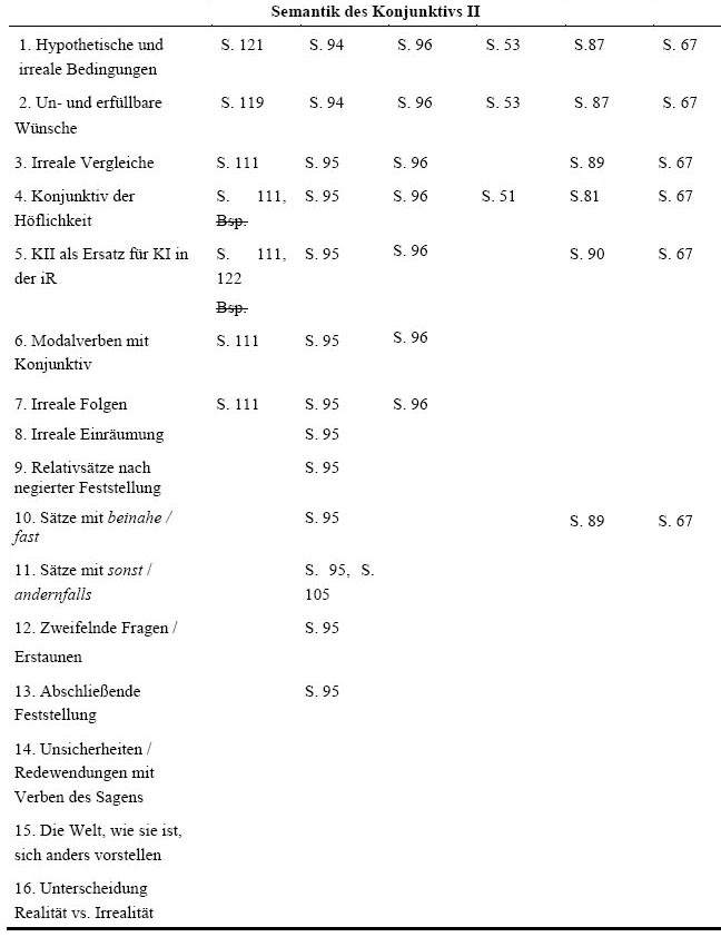 Die folgenden zwei Tabellen zeigen, welche Verwendungsweisen des Konjunktivs die einzelnen Lern- und Übungsgrammatiken erwähnen. Die Seitenzahlen verweisen dabei auf zweierlei: Auf der einen Seite geben sie beim Indirektheitskonjunktiv an, auf welchen Seiten die Grammatiken Spezifizierungen vornehmen und erklären, wozu der Konjunktiv der indirekten Rede (iR) dient. Gibt es keine Spezifizierung, wurde dies mit Spez. gekennzeichnet. Auf der anderen Seite verweisen die restlichen Seitenzahlen darauf, auf welcher Seite ein Beispiel für die jeweilige Verwendungsweise zu finden ist. Wurde die Verwendungsweise ohne konkretes Beispiel erwähnt, wurde dies mit Bsp. ausgedrückt.