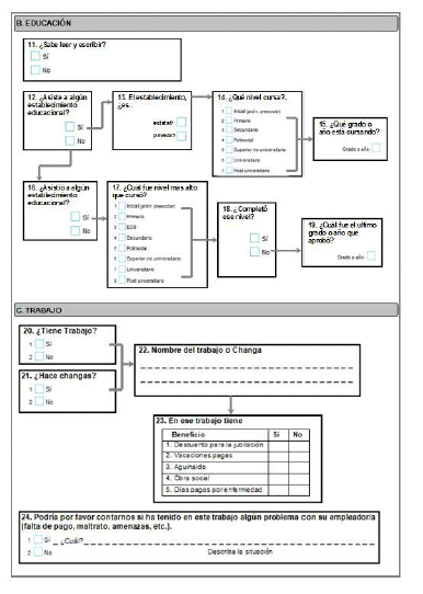 En segundo lugar, una vez identificadas las áreas de interés de las mujeres afroargentinas del Barrio BID/Villegas participantes, se procedió a delinear módulos para recoger información. La necesidad de tener que acortar el tiempo de toma del cuestionario para no generar rechazo logrando encuestas válidas, y de buscar además información poblacional específica, llevó a reducir las áreas de interés a los siguientes módulos: 1-autorreconocimiento y reconocimiento familiar/memoria genealógica; 2-nivel de educación; 3-situación laboral; 4-cuidado de la salud; 5-situación familiar (pareja, hijos); 6-vivienda; 7-discriminación. Cada uno de estos módulos contaría con preguntas específicas dentro del cuestionario.