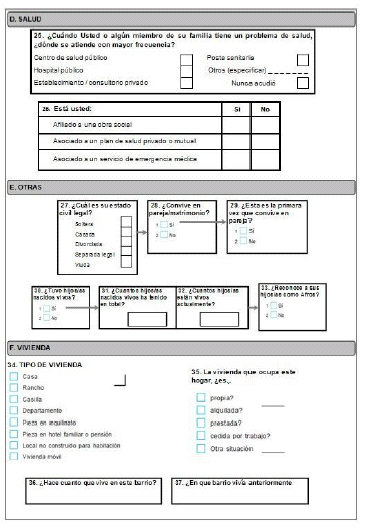 El cuestionario final constó de 41 peguntas, 39 de respuestas cerradas y 2 preguntas abiertas. Se estructuró en 7 bloques (composición del hogar, afrodescendencia, educación, trabajo, salud, otros y vivienda) más la posibilidad de registrar observaciones abiertas.
