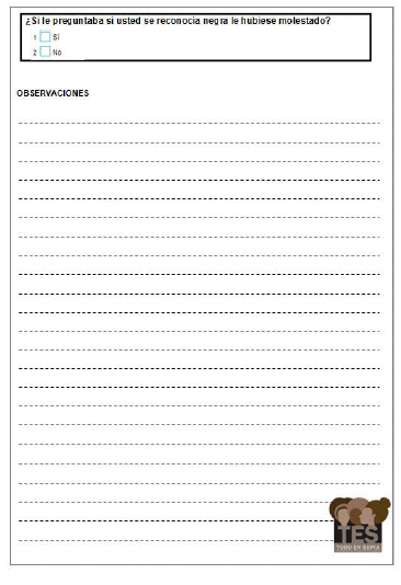 En la etapa siguiente, el diseño del cuestionario, se procedió a una reunión de discusión para definir las preguntas. Fue de particular importancia la (acalorada) discusión acerca de qué palabras utilizar, y cómo, en relación con la terminología de autorreconocimiento. Como mencionamos en la Introducción, este tema es particularmente importante ya que puede definir que el/la potencial encuestado/a se autorreconozca o no y puede llegar a influir de manera crucial en los resultados. Finalmente, se decidió realizar la pregunta utilizando el término afrodescendiente y agregar una pregunta abierta al final del cuestionario: ¿Le hubiera molestado si le preguntaba si usted se reconocía como Negra? La intención de este agregado fue conocer cómo reaccionarían otras personas no involucradas en el taller a estos apelativos, así como evaluar el grado de conocimiento del vocablo afrodescendiente entre la población, ya que –recordemos- éste había resultado desconocido en la Prueba Piloto del año 2005 entre la población encuestada. Además, como uno de los objetivos del proyecto era aportar a la discusión con el INDEC con miras a la inclusión de la pregunta sobre autorreconocimiento afro en el Censo 2020, entre otras políticas públicas, se puso especial énfasis en este tema.