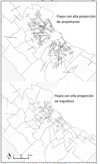 Por otro lado, tal como se ha mencionado previamente, el aumento de los hogares inquilinos fue una de las características del periodo considerado y esa cuestión también influencia en las trayectorias. Puede afirmarse que la propiedad de la vivienda disminuye la movilidad residencial, mientras que el alquiler produce lo contrario. Así, en un contexto en el que aumentan el porcentaje de inquilinos, también podría aumentar los niveles de movilidad residencial de la población. Además, el régimen de tenencia no sólo implica mayor o menor movilidad, sino que está vinculada a la dirección de los trayectos. La adquisición de la propiedad de la vivienda empuja a hogares a moverse hacia lugares menos centrales, mientras que otros optan por el alquiler para acercarse a la centralidad.
