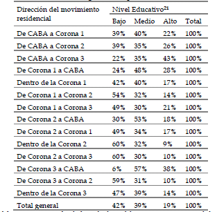 En ese sentido, la movilidad residencial reproduce y acentúa la división social del espacio, en la medida en que los sectores sociales con niveles educativos más elevados tienden a mudarse hacia zonas con mejores infraestructuras y donde ya se concentran esos mismos sectores. Al mismo tiempo, la población de menor nivel socioeconómico se ve expulsada a las periferias. Sin embargo, la periferia no sólo es el destino de los más desfavorecidos, por el contrario, los partidos del segundo y tercer cordón -principalmente de la zona norte- que experimentaron una fuerte expansión de barrios cerrados, recibieron un importante flujo de población con alto nivel educativo provenientes de los lugares más centrales.
