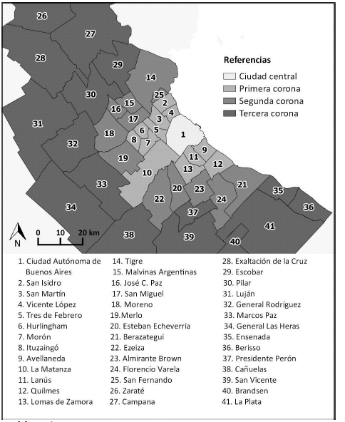 De ese modo, se comprende al área metropolitana como el producto histórico de una serie de procesos multidimensionales que se plasmaron territorialmente. Un abordaje clásico al estudio de la RMBA es a través de las coronas o anillos que rodean a la ciudad central, debido a que en cada uno de ellos se pueden reconocer, con mayor o menor claridad, las huellas que cada etapa histórica ha dejado en la ciudad y que, por ende, poseen características socioeconómicas y habitacionales diferenciales. Así a continuación, se observa a grandes rasgos qué cambios experimentaron la CABA y las tres coronas de la RMBA durante el periodo neodesarrollista.