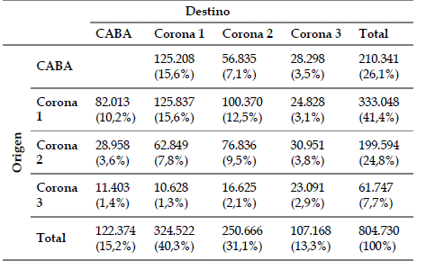 Hasta el momento se ha observado el proceso de movilidad residencial siempre en términos relativos a la población de cada partido. A continuación, se explora esto en cifras absolutas y relativas a la totalidad de los movimientos residenciales. En el cuadro 2 se ve cómo se distribuyen los 804.730 movimientos según origen y destino. Se observa que la primera corona concentra la mayor parte de los desplazamientos tanto de origen como de destino. Por otra parte, dichas tablas permiten apreciar que dentro de cada anillo también existe una intensa dinámica de intercambio de población. Además, la población que emigra desde la CABA lo hace fundamentalmente hacia la primera corona. La segunda corona recibe una gran cantidad de habitantes provenientes de la primera, mientras que también hay un importante flujo inverso, aunque de todas maneras mucho menor. En cuanto a la tercera corona, a causa de su menor densidad poblacional, su participación en la totalidad de los movimientos se considerablemente menor. Sin embargo, cabe destacar que, a pesar de esa menor proporción, la diferencia entre los que parten desde la tercera corona con los que llegan es de más de 5 puntos porcentuales.