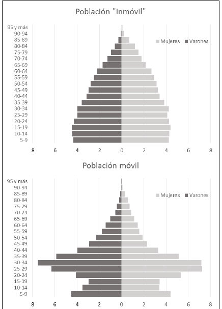 Un primer abordaje para conocer quiénes cambian de residencia puede realizarse a través del tradicional análisis de la composición demográfica por edad y sexo mediante las pirámides de población. Se observan (Figura 5) grandes diferencias entre los móviles y los inmóviles.13 La movilidad residencial es un proceso que afecta particularmente a la población comprendida entre la franja de los 25 y 39 años, es decir, adultos jóvenes. Por lo tanto, la asociación entre el ciclo de vida y la movilidad residencial es evidente, principalmente relacionada a la obtención de la autonomía residencial y la conformación de un hogar independiente al de origen. Asimismo, a partir de los 40 años la probabilidad de cambiar de residencia disminuye.