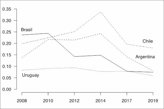 En el Cono Sur, por el contrario, la identificación con la derecha sí ha aumentado en algunos países (Figura 4). En primer lugar, un incremento importante de la identificación con la derecha se da en Brasil que pasa de 17,8% en 2008 a 21,9% en 2017 y 31,5% en 2019 (p<0.000), coincidiendo con la victoria de Bolsonaro quien asume la presidencia de Brasil el 1 de enero de 2019.[10] Un incremento de la identificación con la derecha también se observa en Argentina, en donde el porcentaje de encuestados que se consideran de derecha o centroderecha pasa de 11,9% en 2008 a 15,6% en 2019 (p<0.029), con un piso de 7,6% en 2010. Este aumento de la identificación con la derecha se da en paralelo con el aumento del poder y relevancia del PRO, el primer partido de derecha en llegar al poder por vía democrática en Argentina.[11] El año 2010 también marca el inicio de un cambio de tendencia en Chile y en Uruguay. En 2010, la identificación con la derecha comienza a bajar en Chile pasando de 14,4% en 2010 a 11,7% en 2019, aunque la diferencia no es estadísticamente significativa (p<0.062). En Uruguay, en cambio, la identificación con la derecha comienza a subir ese mismo año, pasando de 15,4% en 2010 a 20,5% en 2019 (p<0.001).
