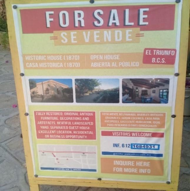 Al margen de la actividad inmobiliaria realizada por la empresa de Walton, también se ha abierto un mercado para otros agentes, como un miembro de la familia Coppola[11] que es pionera de la actividad turística en el vecino municipio de Los Cabos. Al caminar por las calles, los visitantes pueden leer anuncios donde se venden casas y terrenos producto de la actividad inmobiliaria. Los letreros de venta de propiedades están en versión bilingüe o simplemente en inglés (Figura 10), lengua alrededor de la que opera el mercado turístico e inmobiliario de alto ingreso en el estado.