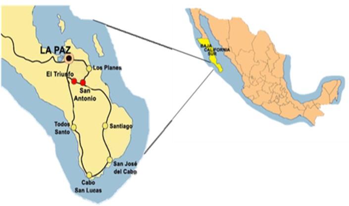 El distrito minero San Antonio-El Triunfo se ubica en una zona accidentada y montañosa al sureste del municipio de La Paz en BCS (Figura 1), por el lado del golfo de California de la península de Baja California. El Triunfo surge en el año 1748 cuando Manuel de Ocio, ex militar que habitó Loreto, en el mismo territorio, fundó el Real de Minas de Santa Ana y tres años después explotó la mina El Triunfo de Santa Cruz (González y Rivas, 2014). De 1753 a 1768 el Real de Minas de Santa Ana extrajo seis toneladas de plata; tras ese periodo, las minas pasaron a ser controladas por el gobierno del virreinato de la Nueva España (Romero y Ortega, 2013).