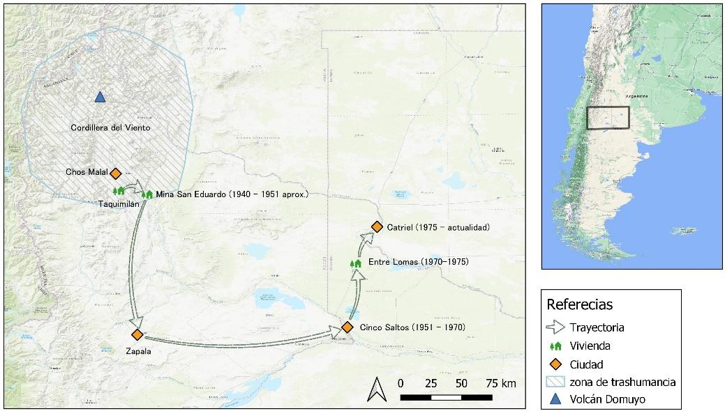 Los primeros integrantes de la comunidad Newen Mapu de los que se tiene recuerdo provienen del norte de la actual provincia de Neuquén. Cuenta la lonko (autoridad comunitaria) Rosa Quintana que en la zona rural de Taquimilán, a unos 15 km de Chos Malal, nació Delmira, su abuela, alrededor de 1910 (véase Figura 2). En ese momento, el desarrollo del proyecto político de territorialización del Estado argentino era aún incipiente en el norte del entonces Territorio Nacional del Neuquén, en vinculación con tres formas de avance del capital. Mientras que en el área de confluencia de los ríos Limay y Neuquén se desarrollaba la producción agrícola con destino a los mercados interno y externo, con utilización de mano de obra familiar y asalariada, en la zona sur la principal actividad era la ganadería extensiva realizada en grandes estancias que empleaban trabajadores asalariados de tipo permanente y estacional. En el resto del Territorio persistían formas de producción como la agricultura de subsistencia y la ganadería trashumante, realizadas por pequeños productores en tierras fiscales (Mases, 1995). La trashumancia comprendía el desplazamiento estacional entre los campos bajos y áridos de invernada y los valles altos, con mejores pasturas, de las veranadas cordilleranas. Es así como esta práctica económica implicaba un patrón de asentamiento y movilidad que implicaba contar durante el año con dos y hasta tres espacios habitacionales (de invernada, de veranada y, en ocasiones, uno intermedio de primavera) (Padín, 2019):