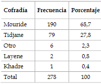 Este tema ha sido incorporado en el relevamiento, consultando a qué cofradía pertenecen los residentes senegaleses en Argentina, considerando que generan una adscripción identitaria que trasciende los límites fronterizos del país subsahariano y extienden sus redes en la migración. En este sentido y al igual que sucede en Senegal, es mayoritaria la pertenencia a la cofradía Mourid, con un 68% de respuestas, seguida de la Tidjanía con un 28%, tal como puede observarse en el cuadro 9.