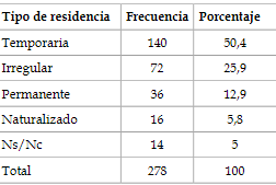 Asimismo, puede observarse que un 50,4% de las personas relevadas posee una residencia temporaria. Esta situación puede ser atribuida al proceso de regularización para migrantes de nacionalidad dominicana y senegalesa que fuera implementado en el año 2013. Este surgió como respuesta a los informes elevados por la Comisión Nacional para los Refugiados (CONARE), que venía siendo testigo del uso de la petición de refugio como estrategia de radicación. De acuerdo a datos expuestos en el informe elaborado en 2016 por Pacceca, Liguori y Carril (2016) para Caref y OIM, entre 2005 y 2012 aproximadamente 850 personas dominicanas y 1.300 personas senegalesas habían solicitado el estatuto de refugiado ante este organismo, lo que los habilitaba a obtener una residencia precaria.