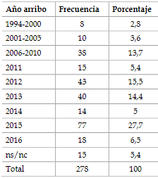Los datos del relevamiento realizado ponen de manifiesto que más de la mitad de los residentes senegaleses que lo han respondido arribaron al país con posterioridad a la puesta en marcha de dicho plan. Ello surge de la pregunta por el año de arribo al país, tal como puede observarse en el cuadro a continuación. Este indicador nos ha permitido calibrar la regularidad/irregularidad migratoria. Tal como puede observarse en el cuadro 11, el mayor porcentaje de residentes ha ingresado en el año 2015 (27,7%), es decir, con posterioridad al plan de regularización. A ello debe adicionarse el 14,4% que lo hizo ese mismo año y es posible que no haya podido ingresar al programa, sumando un 53,6% con aquellos que ingresaron al país entre 2013 y 2016, es decir, con posterioridad al mismo. Con lo cual, muchas de las personas que indicaron contar con residencia temporaria (o esa fue la interpretación de su respuesta en el momento de la codificación) probablemente tuvieran residencia precaria como solicitantes de asilo.