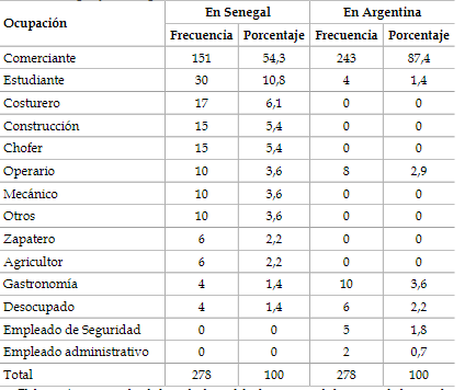 Puede observarse de este modo que la inserción laboral mayoritaria de la población de origen senegalés en la Argentina reproduce aquella que poseen en Senegal, esto es, el comercio, sin embargo, el porcentaje es mucho mayor siendo del 54% en Senegal y del 87% en Argentina. Asimismo, en el país de origen, algunos de estos migrantes se desempeñaban en oficios como la costura, la construcción y zapatería, entre otros, mientras que no han logrado realizar las mismas tareas en el país latinoamericano. Podemos aventurar entre las razones para ello la importancia de las redes comunitarias que facilitan la inserción en la venta ambulante, las dificultades idiomáticas, la falta de documentación para acceder a un trabajo formal y de capital para invertir.