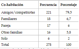 En relación con la situación de co-habitación, en el siguiente cuadro, puede observarse que casi el 80% de los residentes senegaleses en las tres provincias relevadas viven con amigos o compatriotas, mientras que solo el 2% vive solo y el 6% con su pareja, tal como puede observarse en el cuadro 14 y lo cual verifica los datos expuestos en el cuadro anterior.