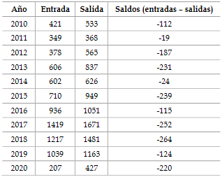 Según los datos de este organismo, en los últimos diez años (2010-2020) siempre han sido superiores las salidas que las entradas en el país. Cabe aclarar nuevamente que dicho organismo registra movimientos, es decir, entradas y salidas, pero no así personas.[11] Aún con esta salvedad, el cuadro a continuación muestra que el número de ingresos y egresos es muy superior a los datos arrojados por el último Censo Nacional de Población Hogares y viviendas del año 2010 y también presenta datos más recientes, llegando hasta el 2020.