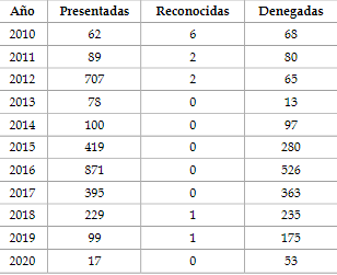 A partir de la información otorgada por el organismo, puede observarse que entre los años 2010 y 2020 el número de solicitudes del estatuto de refugiado asciende a 3.066, a ello deben adicionarse las solicitudes presentadas entre los años 1996 y el 2009, datos con los cuales no contamos a la fecha pero que de todas formas dan cuenta de una cifra muy superior de personas senegalesas en el país a la brindada por el censo nacional de población así como por los ingresos registrados por la DNM, tal como fue presentado en el cuadro 1. Un indicio para pensar que efectivamente el número de residentes en el país es mucho mayor.