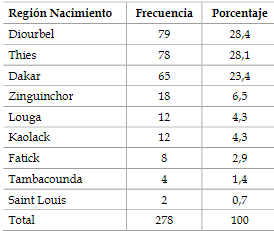 De esta manera se puede constatar que las principales regiones desde donde parten los senegaleses que residen en la Argentina son Diourbel, Thies y Dakar con un 28% de casos en las dos primeras regiones y un 23% para la última.