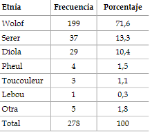 Con relación al relevamiento realizado en la Argentina, se puede constatar cierta correlación en los porcentajes, siendo la wolof la etnia mayoritaria (71%), seguida de la etnia Serer (13%) y Diola (10%). Mientras que otros grupos étnicos se encuentran en porcentajes muy menores, tal como lo refleja el cuadro 7.