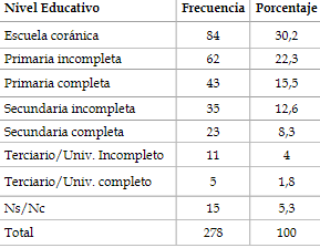 Al indagar por las trayectorias educativas, y siempre considerando que se trata solo de 278 casos y que estos no necesariamente implican una representatividad con el total de la población senegalesa residente en la Argentina, se observa que sólo el 1,8% ha finalizado los estudios terciarios o universitarios, un 8,3% ha finalizado la secundaria y el 15% ha finalizado los estudios primarios. Se desprende del cuadro asimismo que la mayor parte de los encuestados ha concurrido a la escuela coránica, siendo esta una de las razones que explicarían la baja tasa de finalización de estudios secundarios en la educación formal.