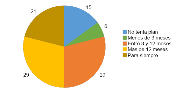 Los planes emigratorios de las personas entrevistadas eran variados, por un lado, algo más de un tercio (35%), planeaba quedarse menos de un año y dentro de este grupo algunos consideraban quedarse menos de 3 meses. Alrededor de 3 de cada 10 proyectaba quedarse más de un año pero no de manera definitiva. Quienes tomaron la decisión de emigrar como un plan más definitivo, es decir planeaban quedarse en forma permanente en España eran el 21% y un porcentaje más pequeño emigró sin ninguna perspectiva temporal (Figura 8).