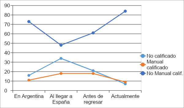Mientras que el 73% de los retornados de TEMPER tenían un trabajo no manual calificado en Argentina antes de viajar a España, la proporción disminuyó al 48% una vez que llegaron a España. Con el tiempo, algunas personas accedieron a trabajos de mayor calificación, aunque, de todos modos, el porcentaje de no manuales calificados en España no alcanzó el mismo nivel que antes de la migración. En efecto, el porcentaje de trabajadores en ocupaciones con esa calificación, aumenta entre el primer empleo en España y el último del 48% al 61%. Una vez en Argentina, los retornados experimentan un proceso de movilidad ascendente, y el porcentaje se incrementa a un 83%.
