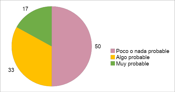 Si bien seis de cada diez retornados/as respondieron que preferirían residir o trabajar en el exterior, el porcentaje que sostiene que es muy probable que ocurra de aquí a 2 años es del 17% y algo probable un tercio (Figura 11). Esto significa que para la mitad la inclinación es solo una preferencia, hasta un deseo, pero con pocos visos de poder efectivizarse. Vale destacar que las personas que formaron parte de la muestra de la Encuesta TEMPER sin experiencia migratoria fueron mucho menos proclives a preferir vivir o trabajar en el exterior.