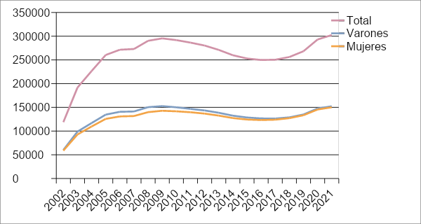 La figura 1, sobre el número de argentinos (stock) en España, expresa estos procesos de cambio tanto en origen como en destino. Desde el año 2000 al 2009 dicho stock pasa de 70.491 a 295.401, momento en el cual comienza a descender como resultado de los efectos de la crisis. Sin embargo, esta tendencia se revierte después de 2016 cuando nuevamente comienza a aumentar en forma ininterrumpida alcanzando niveles similares a los de 2009.