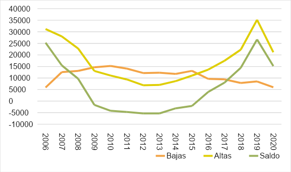 El análisis del comportamiento de las bajas desde el momento que el sistema de registro comienza a funcionar más apropiadamente con la instauración de las bajas administrativas por caducidad, muestra que éstas se reducen desde algo más de 15.000 cuando comienzan a sentirse los coletazos de la crisis en 2010 a alrededor de 8.500 en 2019 y a casi 6.000 en 2020. Esta evolución abre el interrogante acerca de la posibilidad de una nueva ola emigratoria aspecto sobre el cual se volverá más adelante.