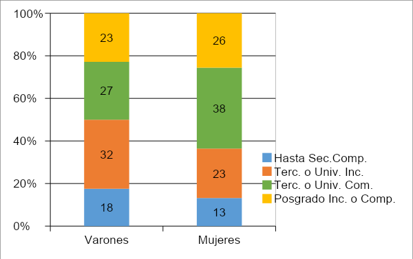 Casi el 40% de los argentinos en España entre 20 y 65 años de edad (edades similares a la de los entrevistados), había alcanzado al menos estudios universitarios.15 Vale destacar, que al igual que lo que ocurre con la población argentina, los perfiles educativos de las mujeres son levemente superiores a los de sus pares varones. Mientras que un 64% de las mujeres retornadas posee al menos un título universitario, en el caso de los varones solo el 50% cuenta con formación superior.