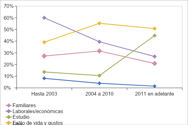 Estas razones principales de la migración difieren según el momento en el que se produjo la emigración. Entre quienes emigraron hasta el año 2003, es decir en pleno período de crisis, más de 6 de cada 10, lo hizo por motivos laborales y económicos como principal argumento. En cambio, a medida que la situación en la Argentina fue mejorando, esta razón fue perdiendo peso en detrimento de las razones vinculadas al estilo de vida o gustos (Figura 4).