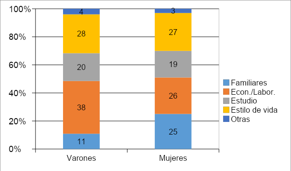 Vale destacar que existen también algunas diferencias de género en los motivos para emigrar. Básicamente los varones aducen con mayor frecuencia como motores de la migración a factores económico-laborales (38% vs. 26%) y, con menor frecuencia a los familiares (11% vs. 25%) (Figura 5). Sin embargo, varones y mujeres comparten con la misma intensidad la motivación de migrar para cambiar de estilo de vida: algo más de un cuarto de unos y de otras brindó esta respuesta como la principal razón para emigrar.