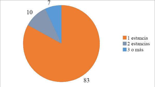 Sin embargo, en el caso de los retornados argentinos la migración recurrente, o circular, parece no constituir un patrón frecuente, donde una elevada proporción debería haber declarado haber emigrado más de una vez. Sin embargo, este no parece ser el caso ya que la inmensa mayoría de las personas retornadas (83%) solo ha tenido una estancia fuera de la Argentina16durante el período 1996-2018 (Figura 7). Un 10% adicional tuvo solo dos migraciones y el 7% restante, es decir una minoría es altamente móvil con 3 migraciones o más.