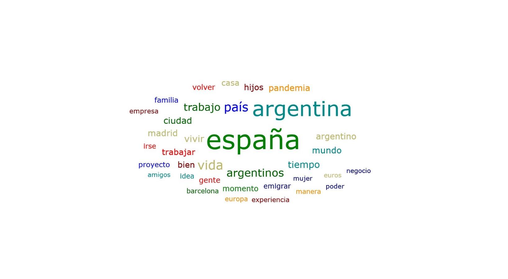 Por otra parte, las citas fueron agrupadas en función de su coherencia en torno a 61 códigos, de los cuales aquellos que registraron mayor frecuencia son los siguientes: “oportunidad” (f= 19); “calidad de vida” (f= 11); “dificultad” (f= 10); “vínculos Argentina-España” (f= 10); “éxito” (f= 10); “ciudadanía europea” (f= 9); “identidad” (f= 8); “seguridad” (f= 7) “tranquilidad” (f= 6); “cultura” (f= 5); “belleza” (f= 4); “experiencia” (f= 4); “estabilidad económica” (f= 4); “historia” (f= 4); “claridad” (f= 3); “previsibilidad” (f= 3); “felicidad” (f= 3); “facilidad” (f= 3); “desafío” (f= 3); “imposibilidad” (f= 3); “educación” (f= 2); “sacrificio” (f= 2); “orden” (f= 2); “libertad” (f= 2); “esfuerzo” (f= 2); “búsqueda” (f= 2); “pérdida” (f= 2); “salud” (f= 2); “ganancia” (f= 2); “poder adquisitivo” (f= 2); “complejidad” (f= 2); “paraíso (f= 2), e “ilusión” (f= 2).