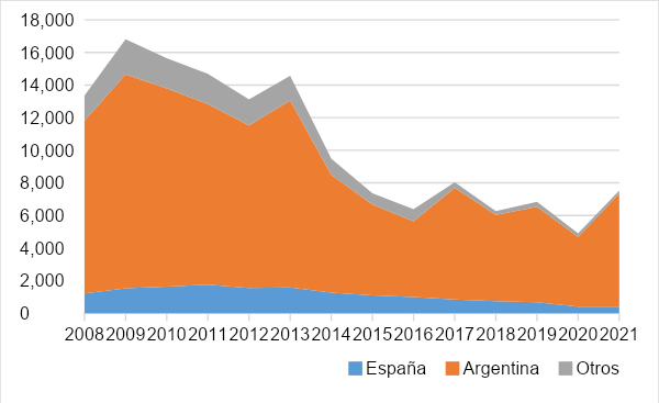 Como comentábamos anteriormente, en el año 2015 hay un cambio de ciclo migratorio, pero fue en 2017 cuando se percibe un incremento significativo de la llegada de argentinos a España que continúa creciendo hasta superar las 30.000 entradas en 2019 y en 2021. El descenso brusco de 2020 estuvo fuertemente atravesado por la cancelación del tráfico aéreo como consecuencia de la pandemia y la COVID-19. No obstante, en semejante coyuntura global, que se produjeran en torno a 20.000 entradas ese año habla a las claras de que se trata de una tendencia firme.