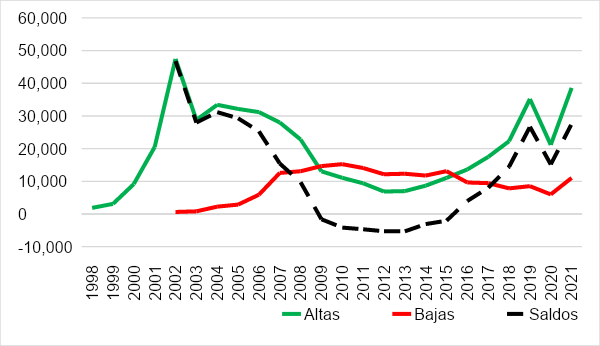 En la Figura 2, a partir de datos de altas y bajas en el padrón municipal de habitantes, se observa la reducción de la llegada de argentinos a España (altas) a partir de 2005, fruto de la estabilización económica en Argentina, y la profundización de esa tendencia a partir de 2008 con el comienzo de la crisis en España. Desde ese momento y hasta 2015 aumentaron los retornos y las re-emigraciones (bajas) produciéndose un saldo migratorio negativo. A partir de 2016 las llegadas vuelven a superar a las salidas y el saldo migratorio se torna positivo.